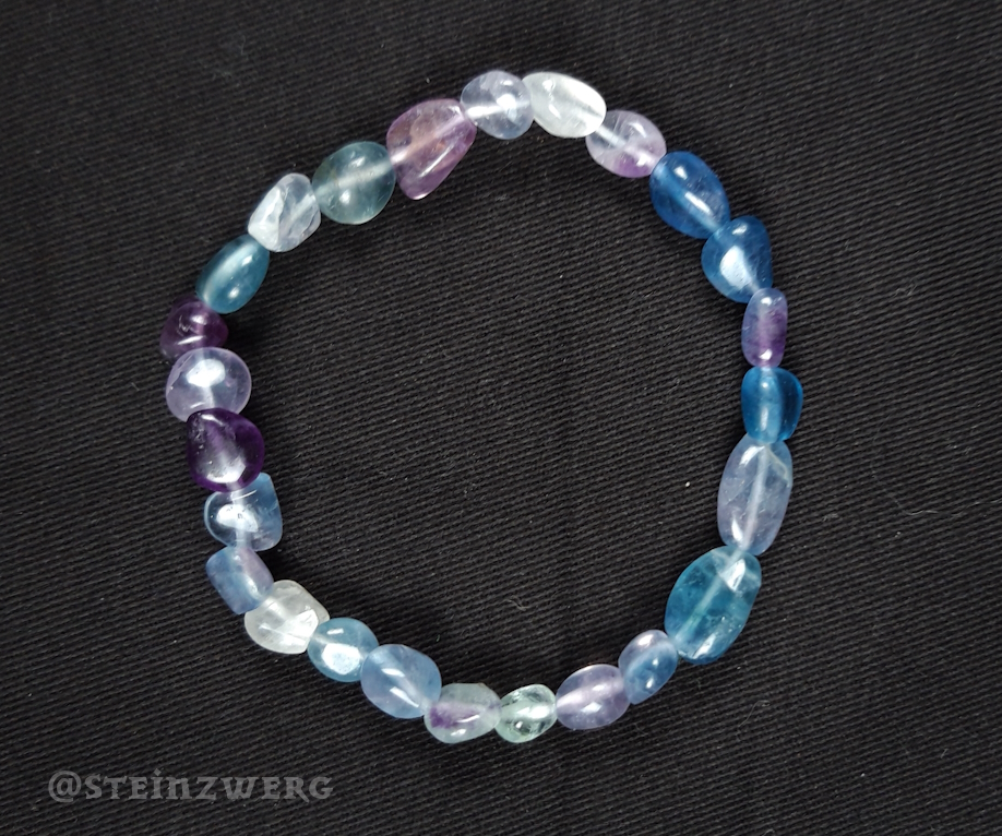 Armband aus getrommelten Fluorit-Nuggets. Es handelt sich hierbei um ein Naturprodukt, welches in Form und Farbe variieren kann. Sie erwerben 1 Exemplar vergleichbarer Qualität.