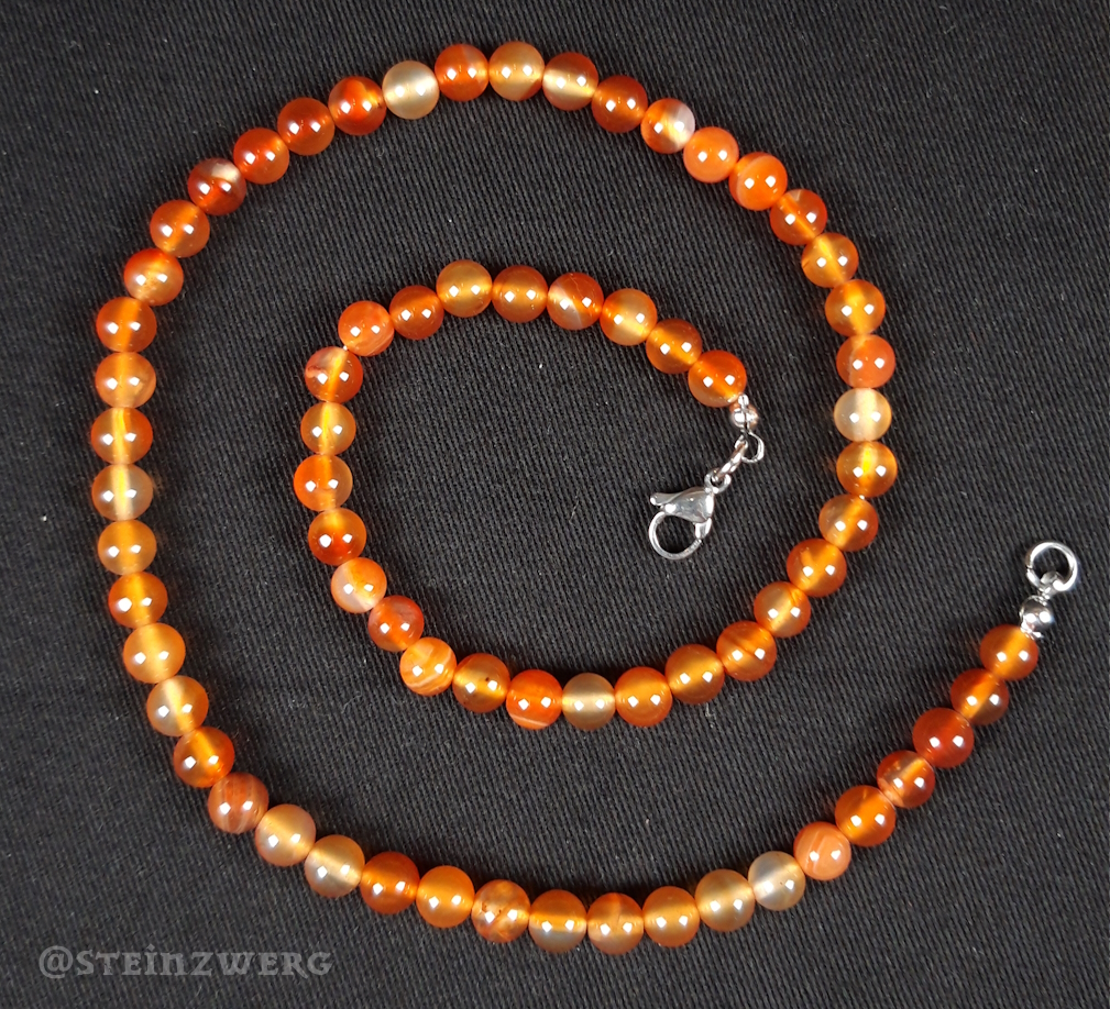 Kugelkette aus Karneol mit silberfarbenem Karabinerverschluss. Es handelt sich hierbei um ein Naturprodukt, welches in Form und Farbe variieren kann. Sie erwerben 1 Exemplar vergleichbarer Qualität.