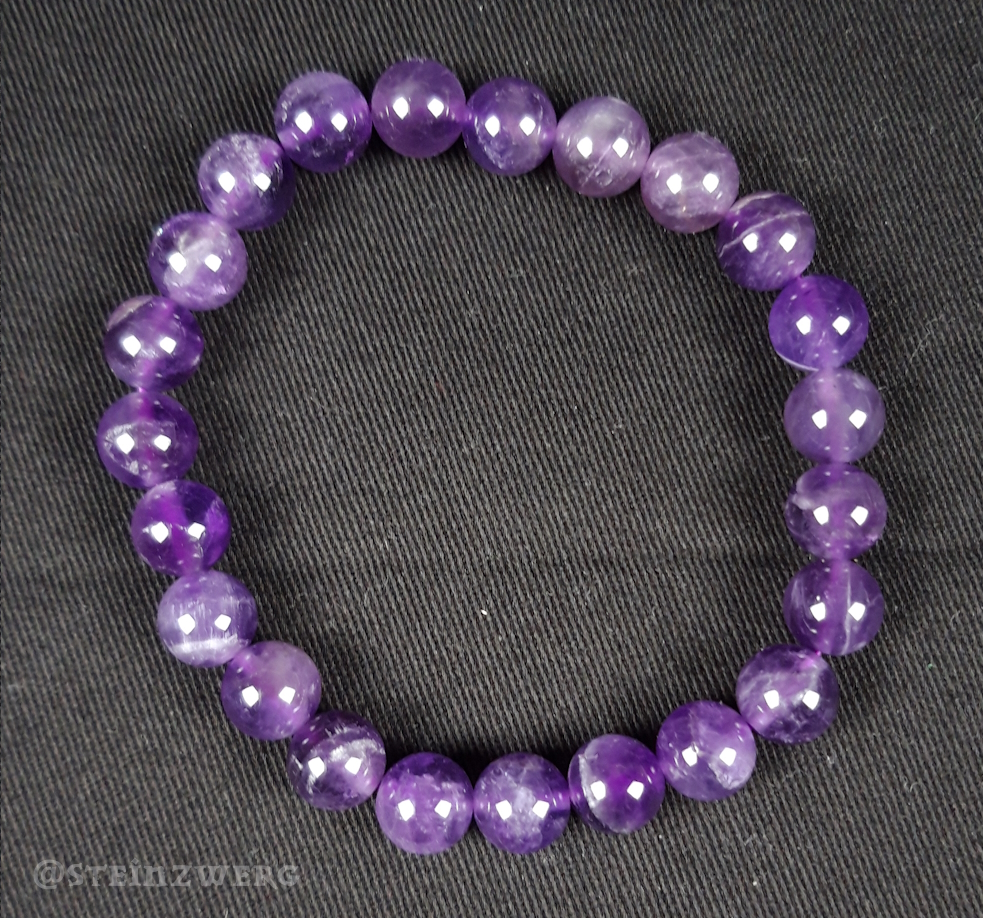 Kugelarmband aus Amethyst. Es handelt sich hierbei um ein Naturprodukt, welches in Form und Farbe variieren kann. Sie erwerben 1 Exemplar vergleichbarer Qualität.