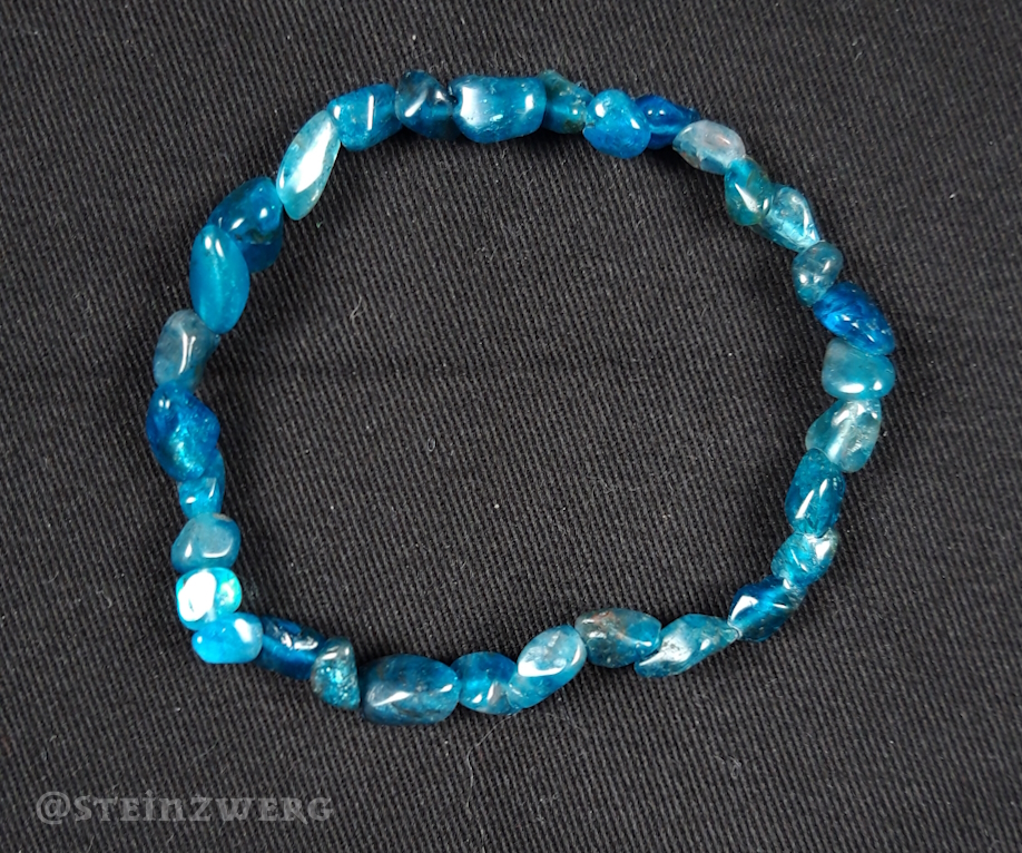 Armband aus getrommelten Apatit-Splittern. Es handelt sich hierbei um ein Naturprodukt, welches in Form und Farbe variieren kann. Sie erwerben 1 Exemplar vergleichbarer Qualität.