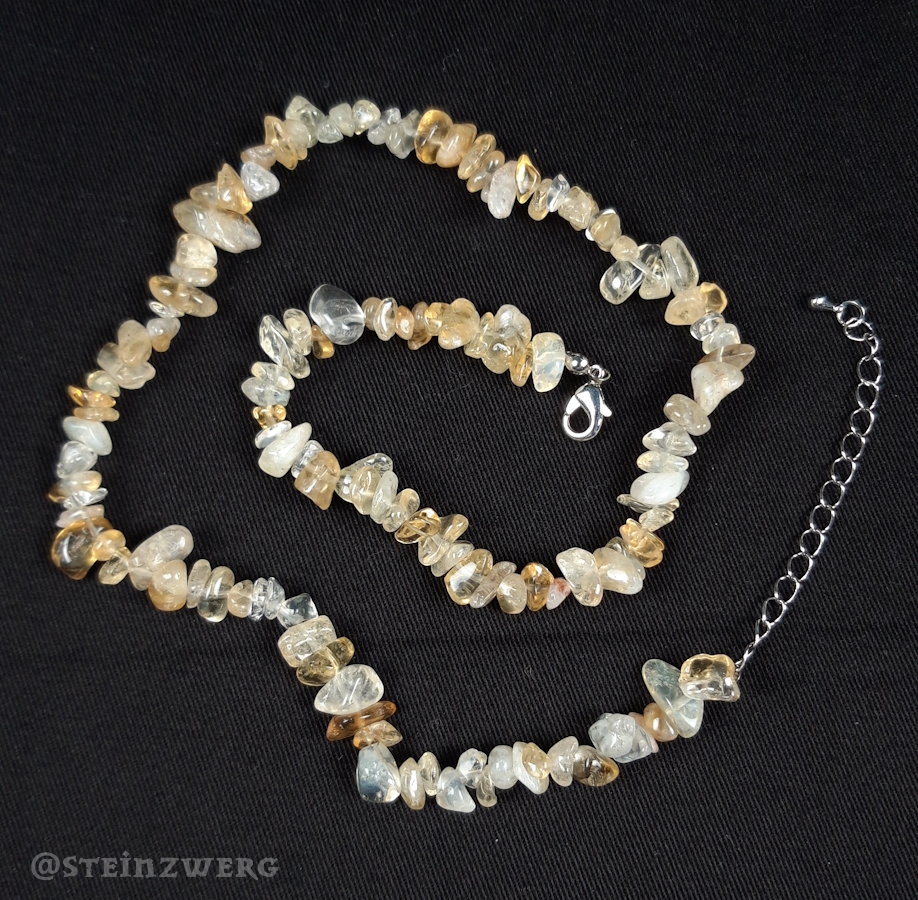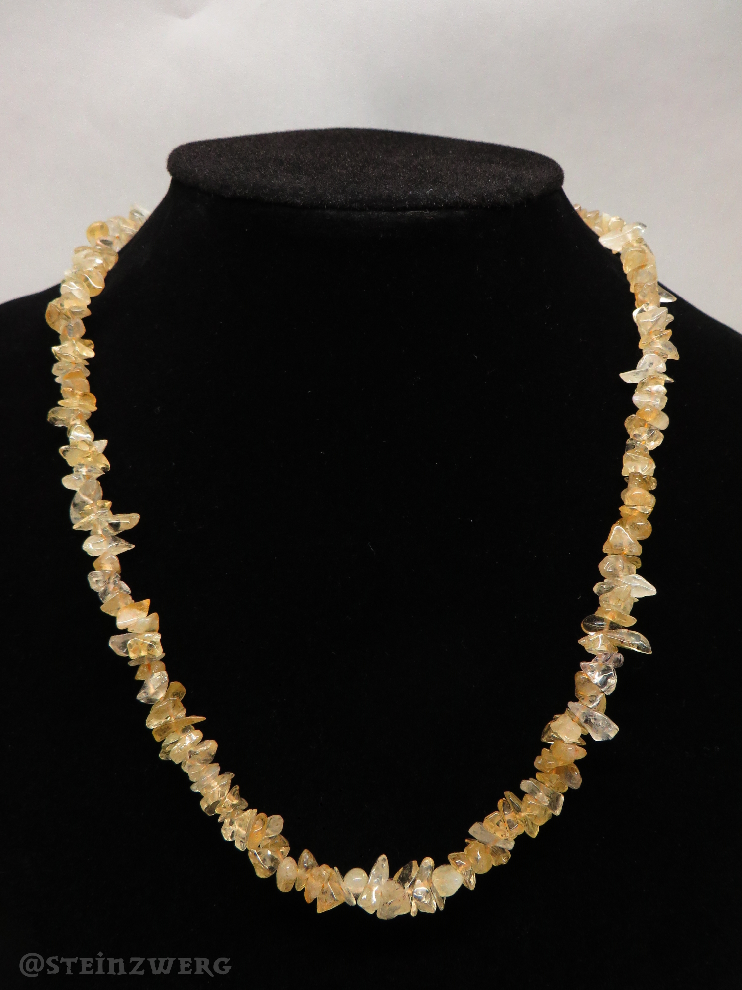 Kette aus getrommelten Citrin-Splittern mit silberfarbenem Karabinerverschluss. Bei diesem Citrin handelt es sich um gebrannten Amethyst.