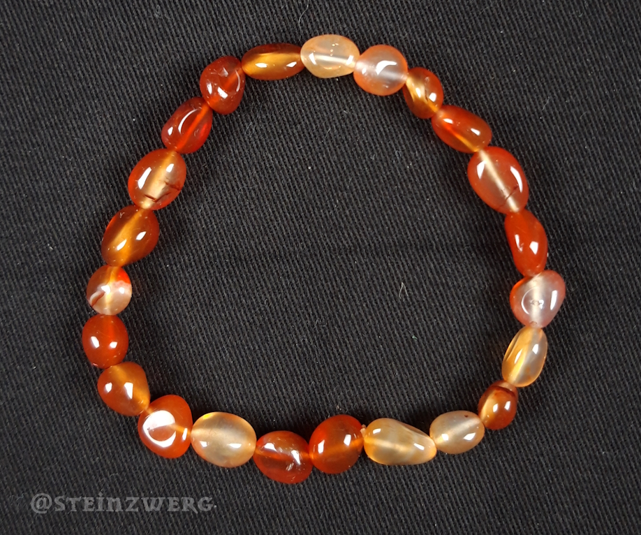 Armband aus getrommelten Karneol-Nuggets. Es handelt sich hierbei um ein Naturprodukt, welches in Form und Farbe variieren kann. Sie erwerben 1 Exemplar vergleichbarer Qualität.