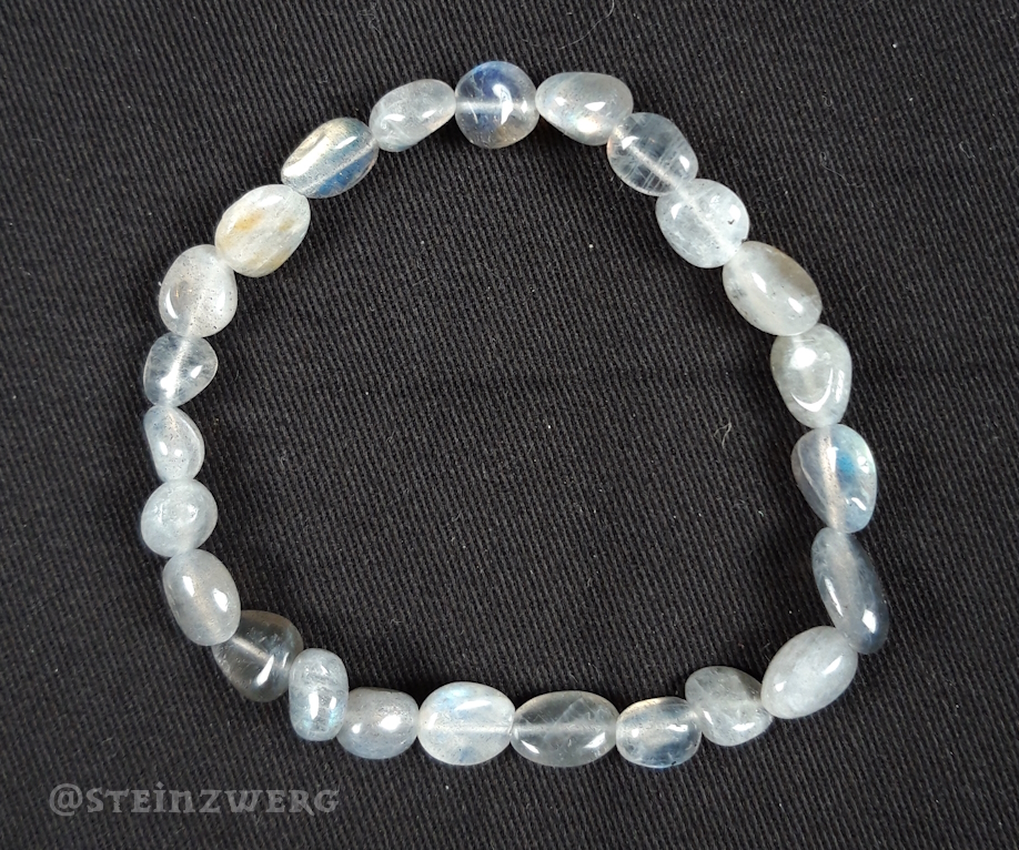 Armband aus getrommelten Labradorit-Nuggets. Es handelt sich hierbei um ein Naturprodukt, welches in Form und Farbe variieren kann. Sie erwerben 1 Exemplar vergleichbarer Qualität.