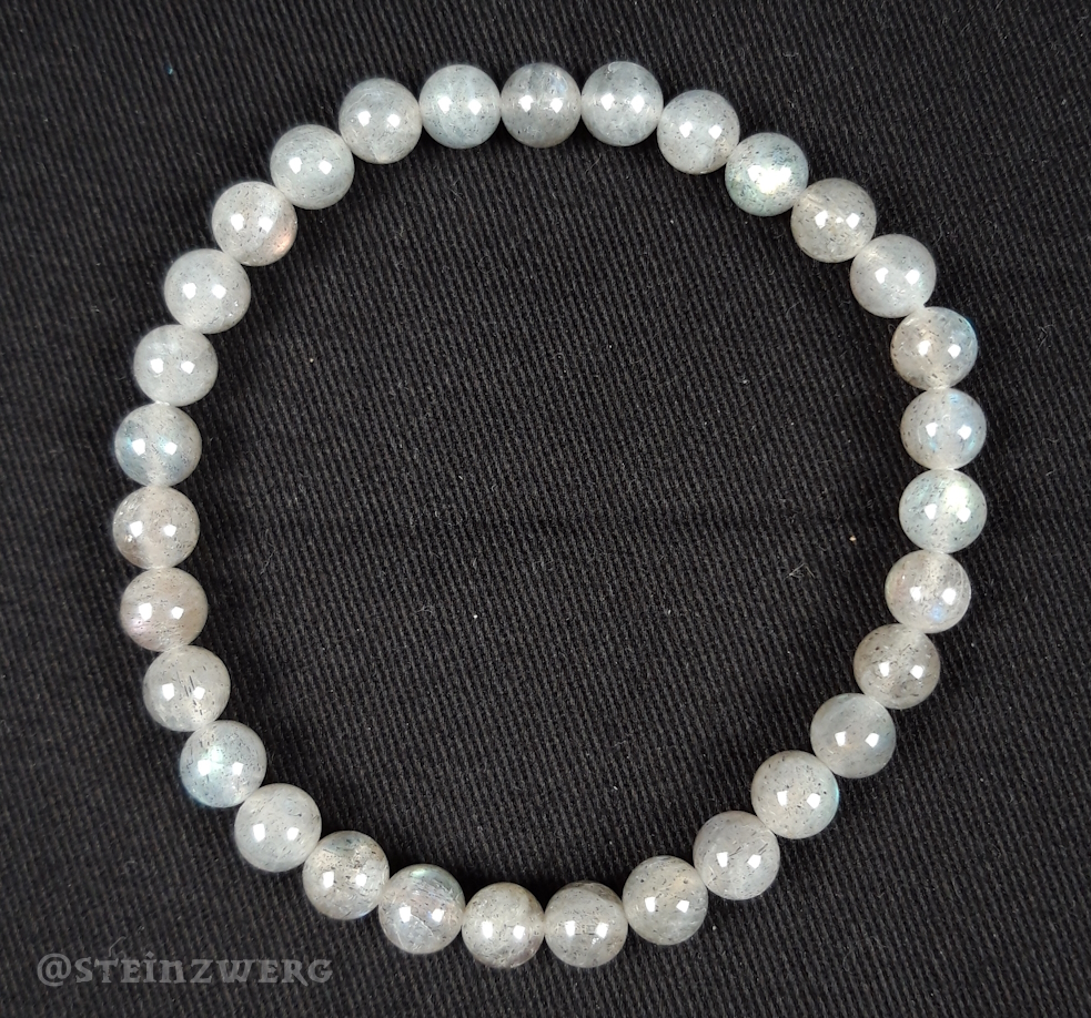 Kugelarmband aus hellem Labradorit. Es handelt sich hierbei um ein Naturprodukt, welches in Form und Farbe variieren kann. Sie erwerben 1 Exemplar vergleichbarer Qualität.