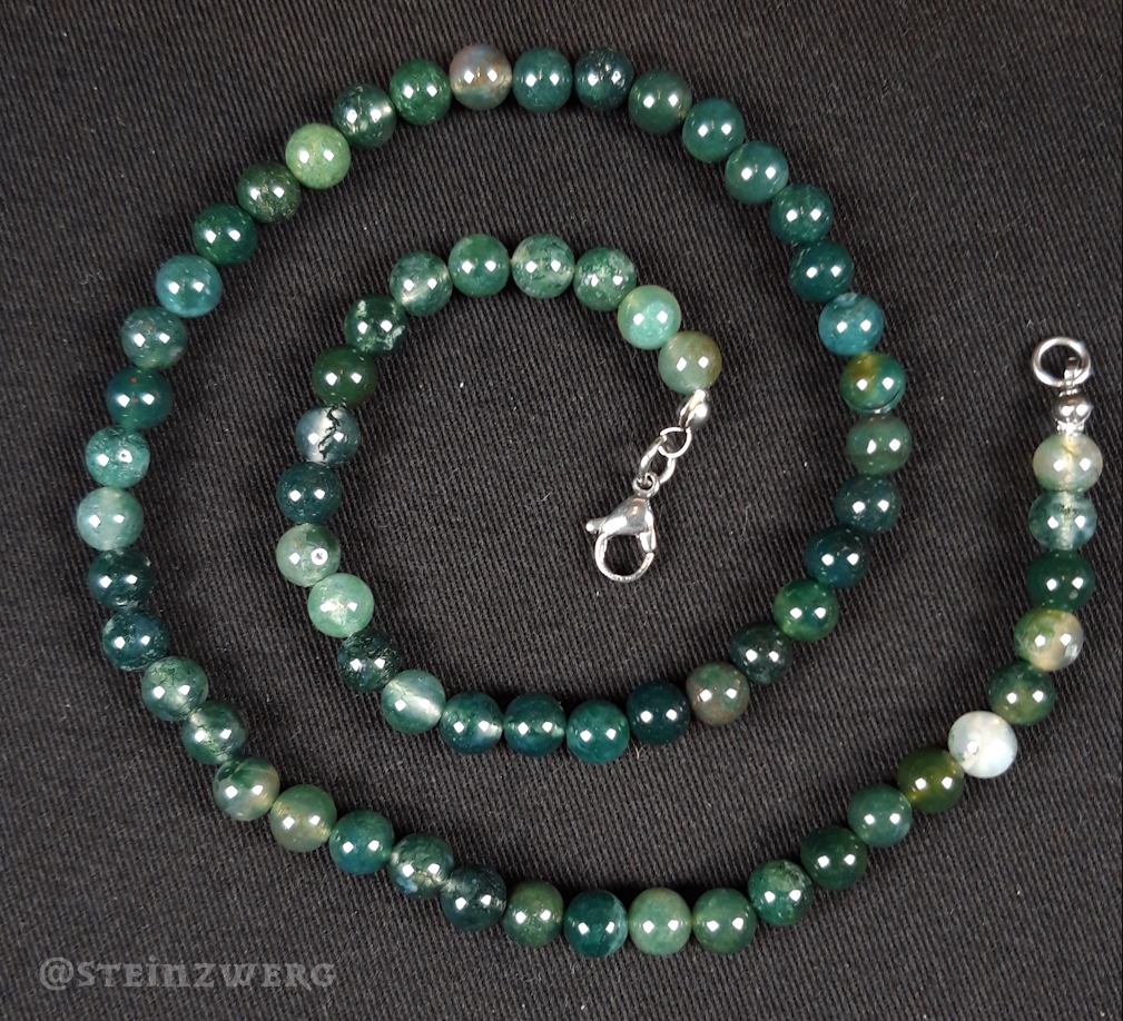 Kugelkette aus Moosachat mit silberfarbenem Karabinerverschluss. Es handelt sich hierbei um ein Naturprodukt, welches in Form und Farbe variieren kann. Sie erwerben 1 Exemplar vergleichbarer Qualität.