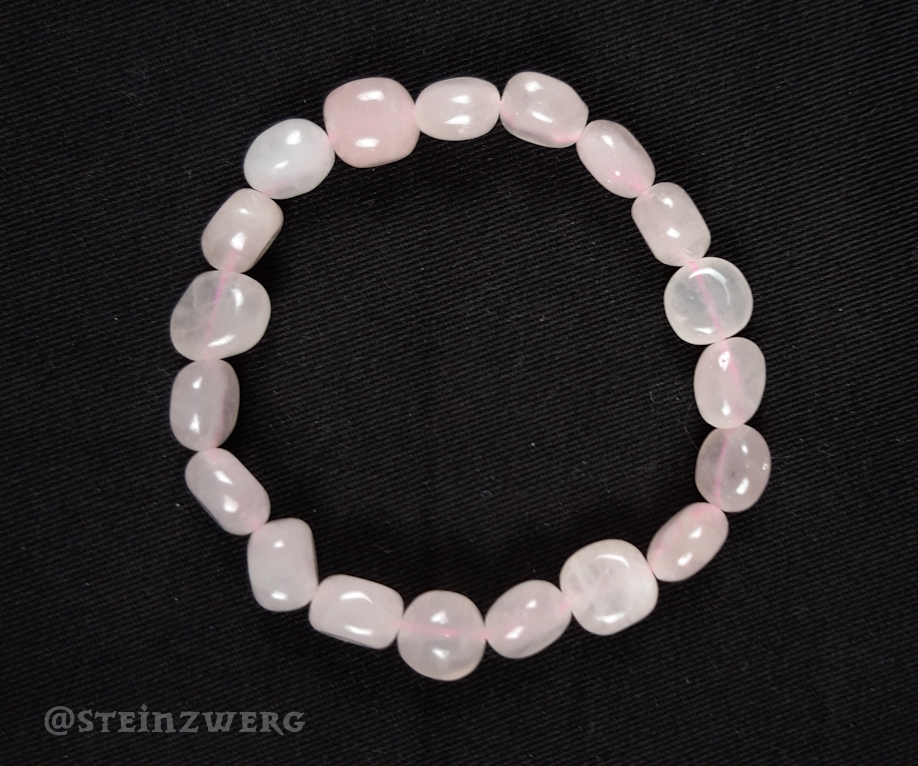 Armband aus getrommelten Rosenquarz-Nuggets. Es handelt sich hierbei um ein Naturprodukt, welches in Form und Farbe variieren kann. Sie erwerben 1 Exemplar vergleichbarer Qualität.