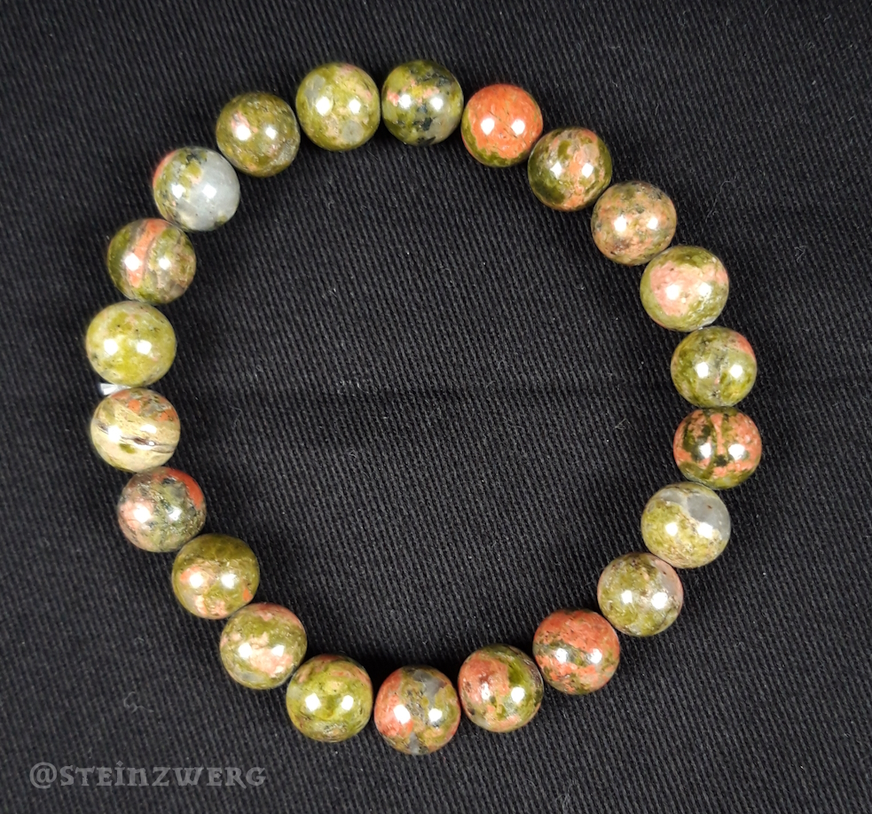 Kugelarmband aus Unakit. Es handelt sich hierbei um ein Naturprodukt, welches in Form und Farbe variieren kann. Sie erwerben 1 Exemplar vergleichbarer Qualität.